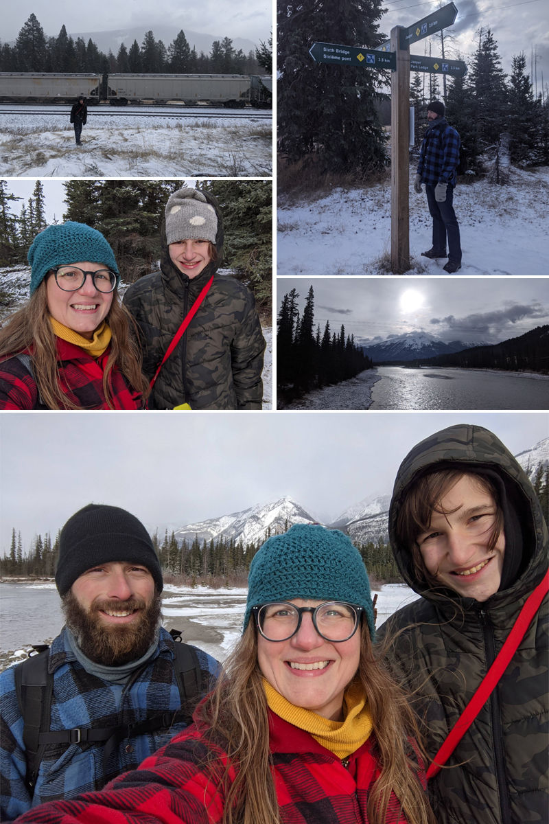 Saturday. Sleep in. Breakfast of bagels and apples in the cabin. Lucas did the dishes. We made wraps for lunch using groceries we brought from Edmonton, and packed them in our bags. One last bathroom and long underwear check, then we headed out. There is a trail that runs along the “back” of town and I absolutely love it. We jump on that and go north until it meets up with the Bighorn Trail (aka Grand Mouflon), and the Pyramid Bench trail system. The goal for today is to get to our fave place for trainspotting, and then set a new goal. After we crossed the Athabasca River at Maligne Road, we followed the trail to the Sixth Bridge (Maligne Canyon). Stopped for a quick lunch there at a picnic table, as it was very cold. Back the same way we came, except we stayed on Bighorn until we made it all the way back to town.