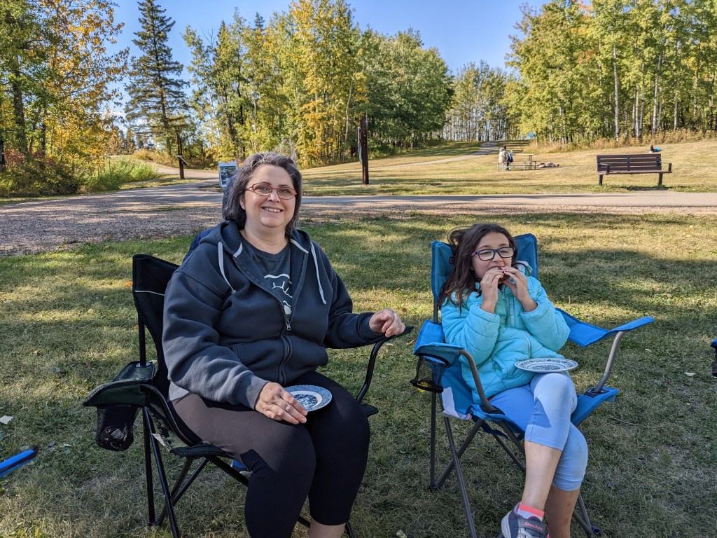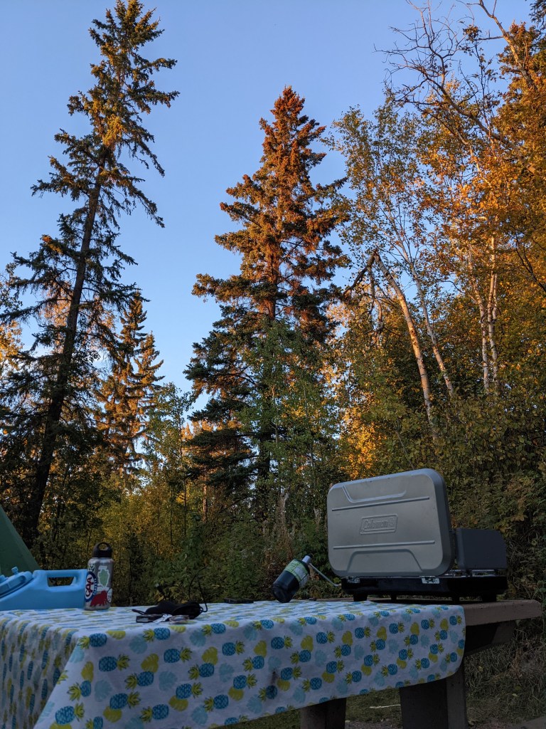 Camping in autumn is a lovely adventure. Chillier in the evenings and overnight. But the cool temperatures and the yellow leaves make for a very pleasant day. We keep the same set up no matter the time of year. And with Krista-Lee joining us, we finally get to make use of our extra dishes! Elk Island National Park is considered a dark sky preserve, and it was very clear on the second night, offering up an amazing view. I am only good at identifying constellations in the city limits. With all those other stars competing for action, I lose my favourites Orion and Auriga. Unfortunately, they are now charging for firewood. But we found that two bags (~$15) gave us a long enough fire on Saturday night to enjoy before an early bedtime.