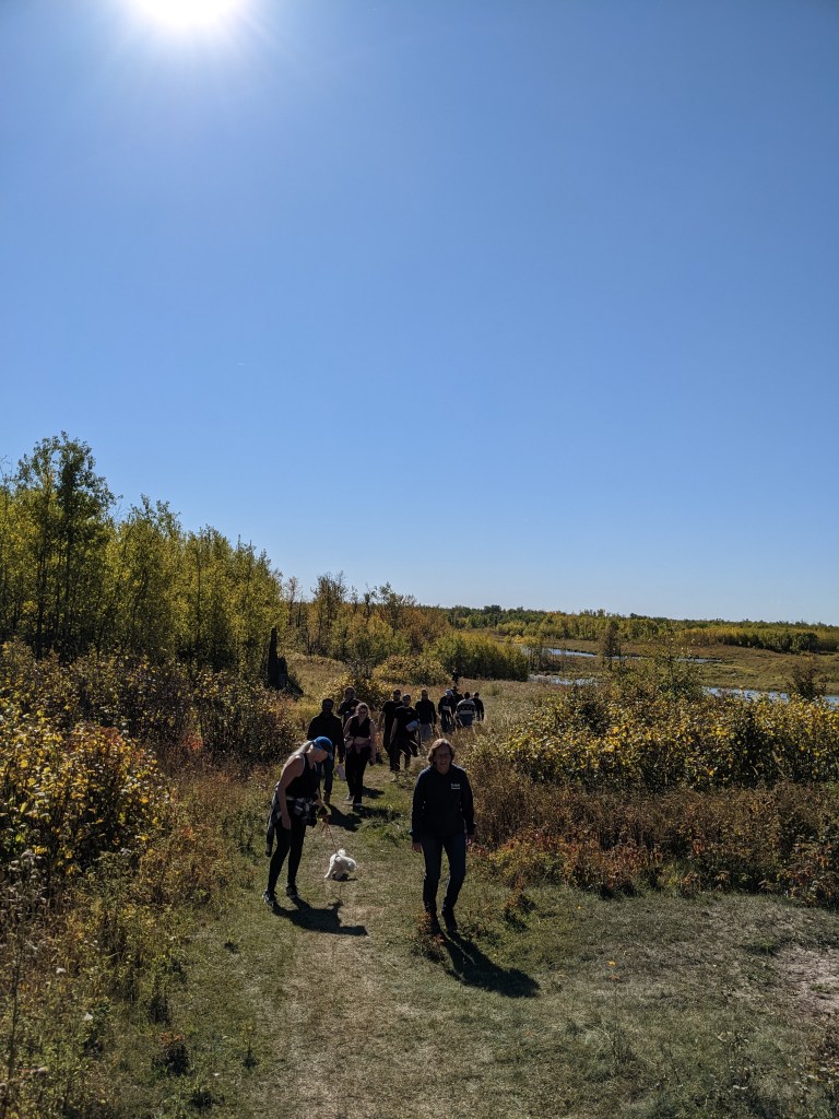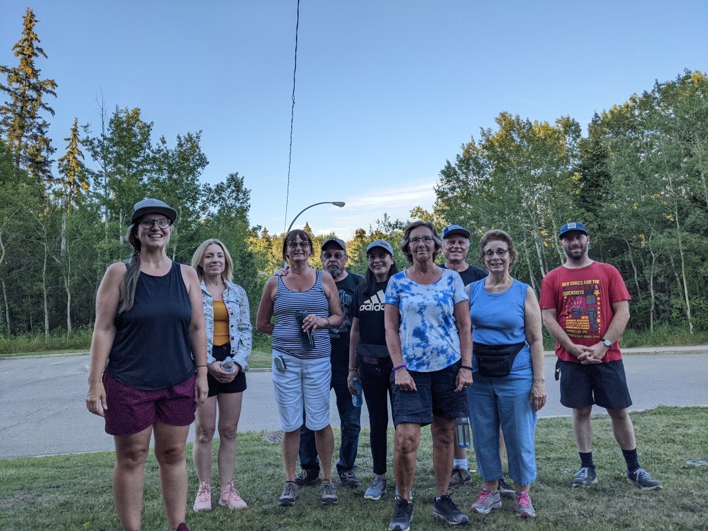 The stats don’t tell all the stories though. And that’s what gets people coming out over and over again. Like our windy hike in Elk Island National Park, where all 22 of us (and 5 dogs) were spread out over almost 1 km! Or the time we had to act as parking attendants at Victoria Park. The stats can’t capture the colour of the sunset, or all the lovely dogs we’ve met. The stats can tell us that we had 6 new hiking enthusiasts join in this summer. But it can’t express the joy in meeting a new person. And the amusement from the rest of the group that Jo Ann sees someone she knows on almost every trail. We did 200 stairs at Glenora and got eaten by more than 200 mosquitos at Mactaggart Sanctuary. We finally saw a beaver in Whitemud Creek! (I’ve been promising this since 2020). The stories showcase the lovely community we are building, one hike at a time.