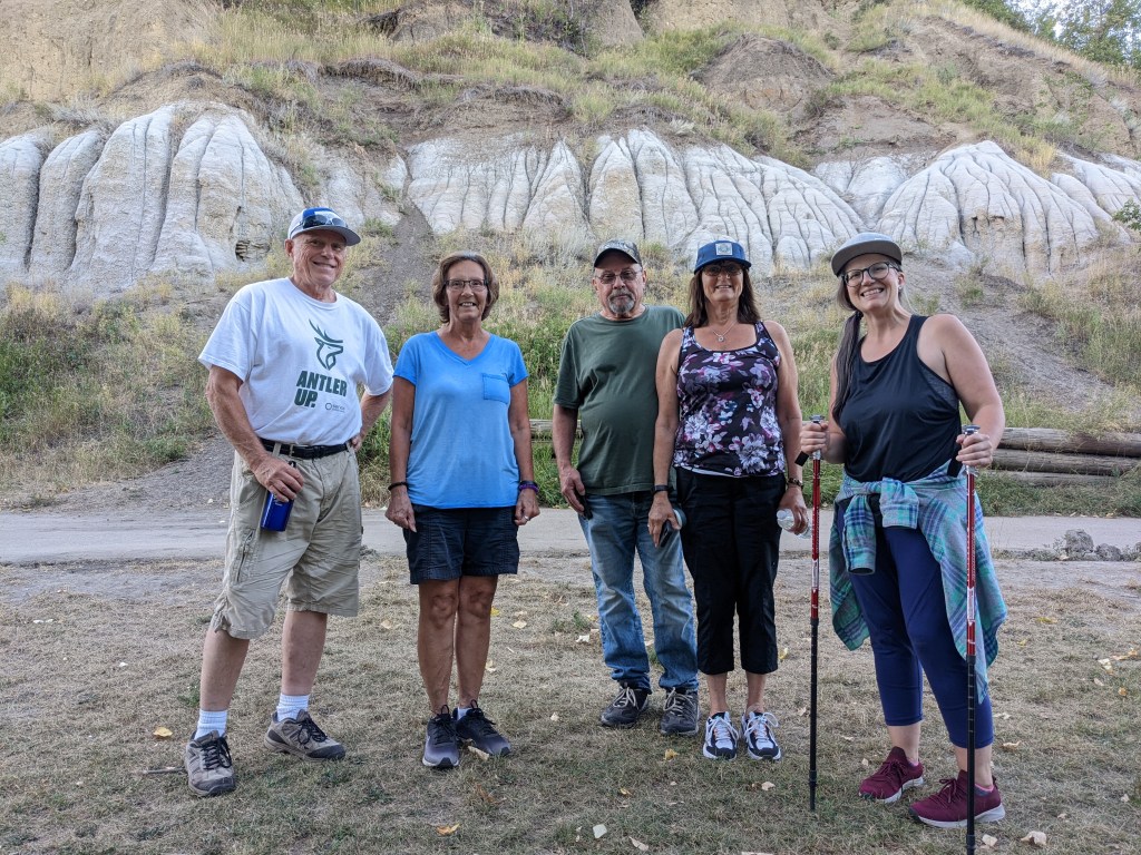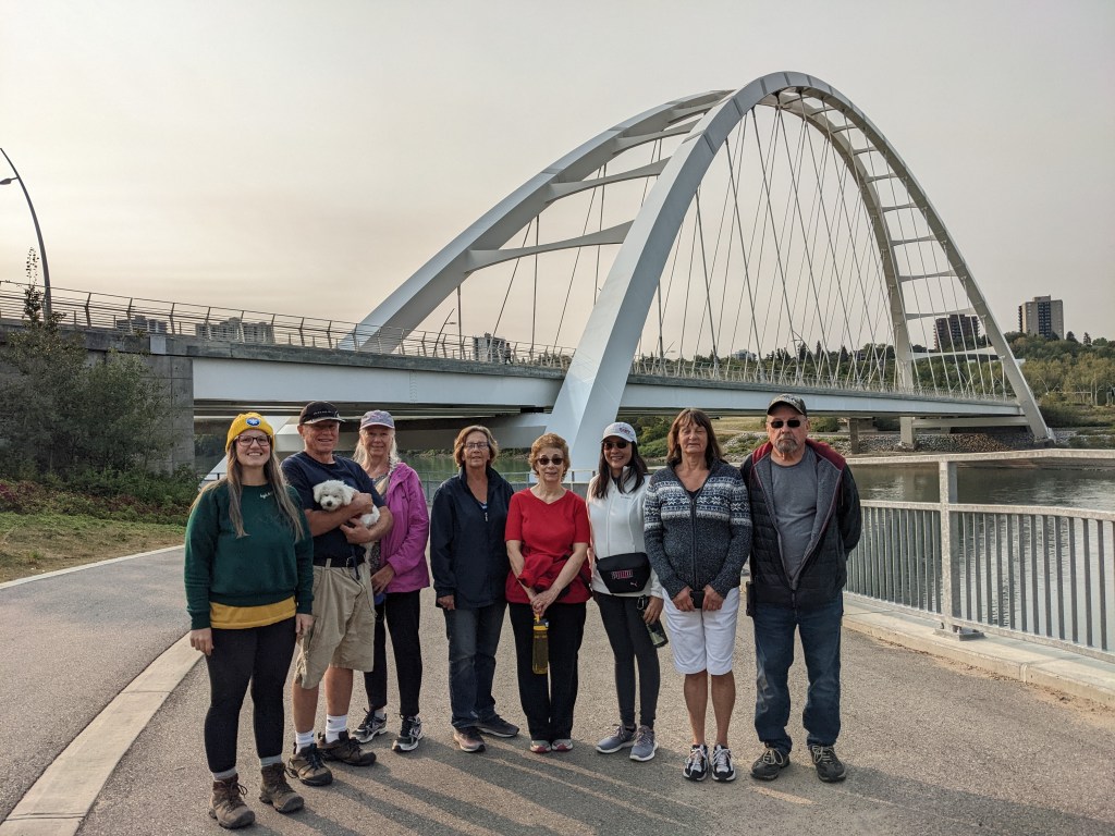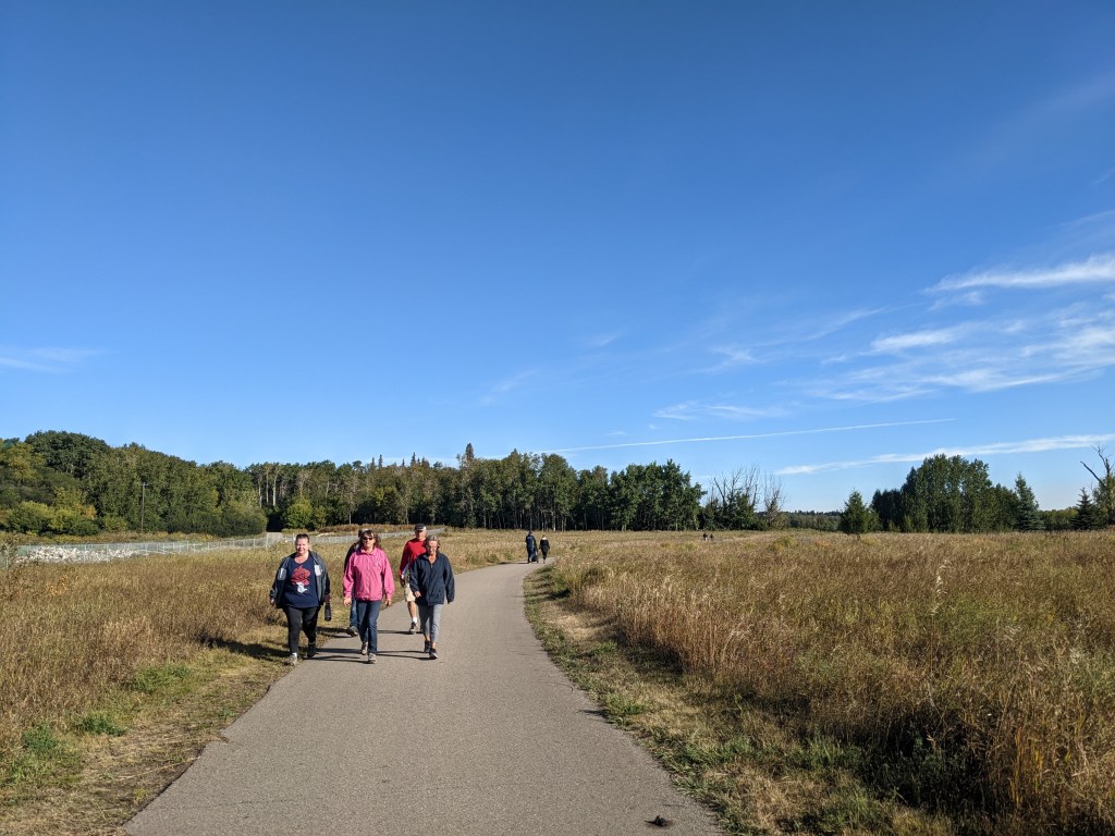 I don’t track our time on each trail, because the goal is to be out for approximately one hour. And sometimes we spend time chatting or taking photos instead of hiking! That’s the “building community” part of our mission. I do, however, watch our distance, which can vary a lot depending on the intensity of the trail. Our shortest distance was ~2.5km in Mactaggart Sanctuary. And our longest was ~6km going from Terwillegar Park to Wolf Willow Stairs and back. Our (approximate) total kilometres for all 12 hikes is 53.5km! (33 miles).