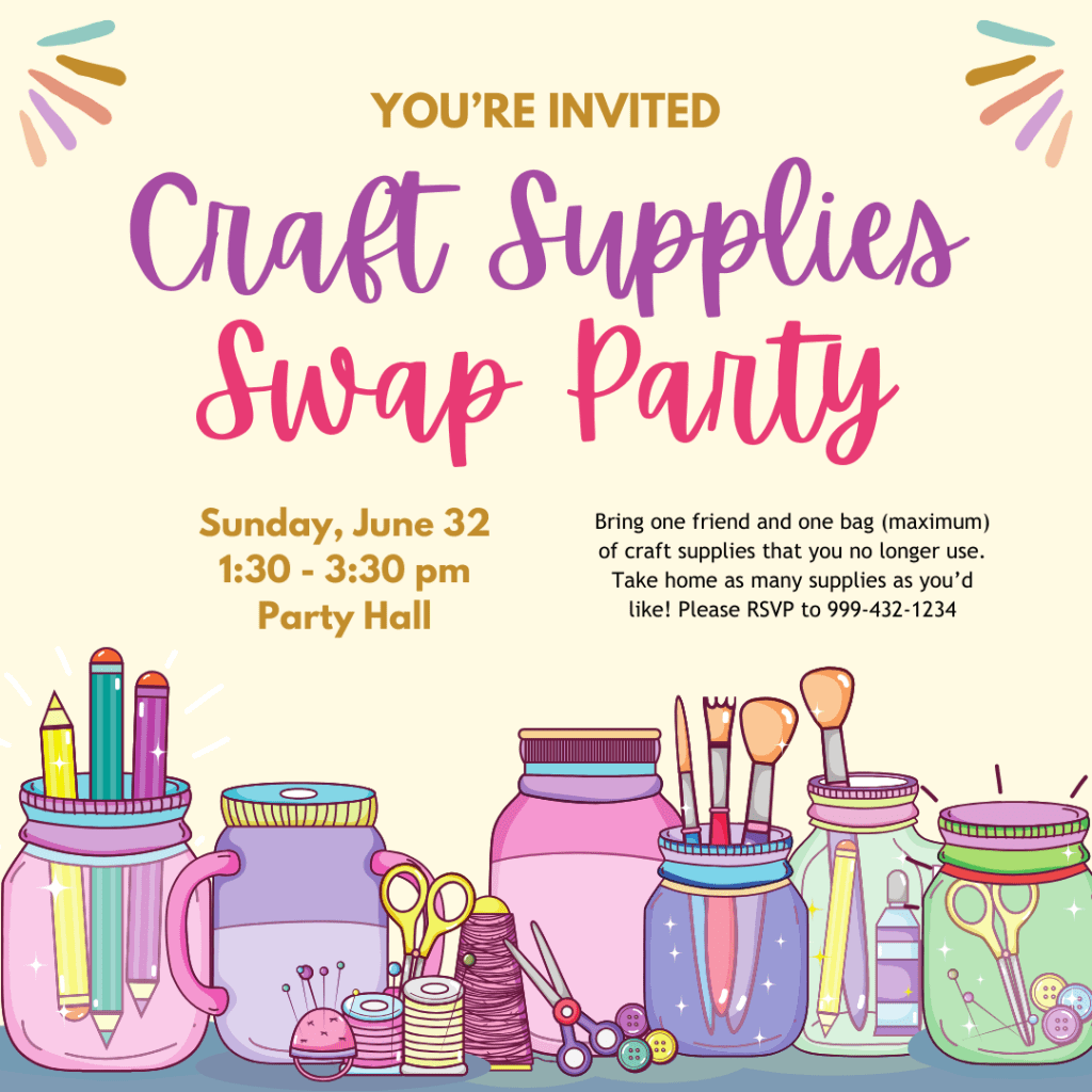 - Host a supplies swap with your crafty friends. If you are a crafter, chances are you have crafty friends or family. Buy a box of wine or a box of pop, some fun snacks, and send out an invite for everyone to bring one friend and a few items to swap.