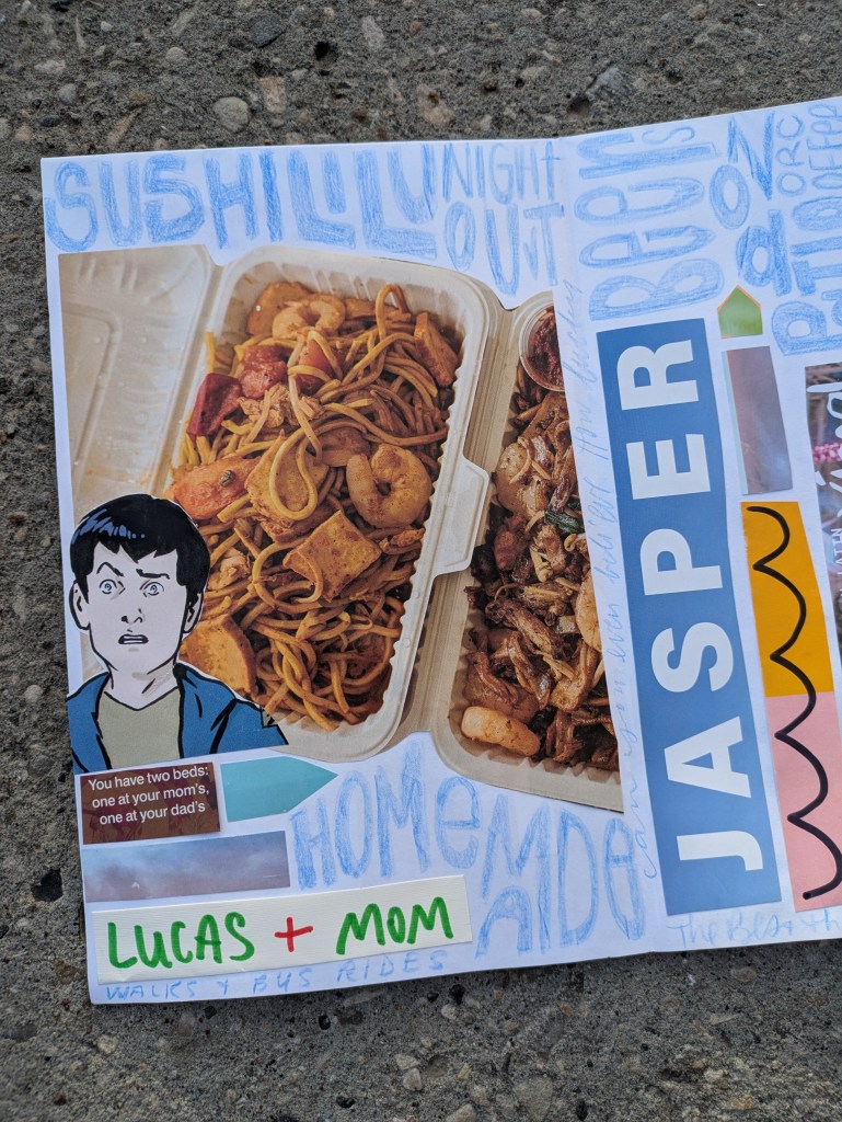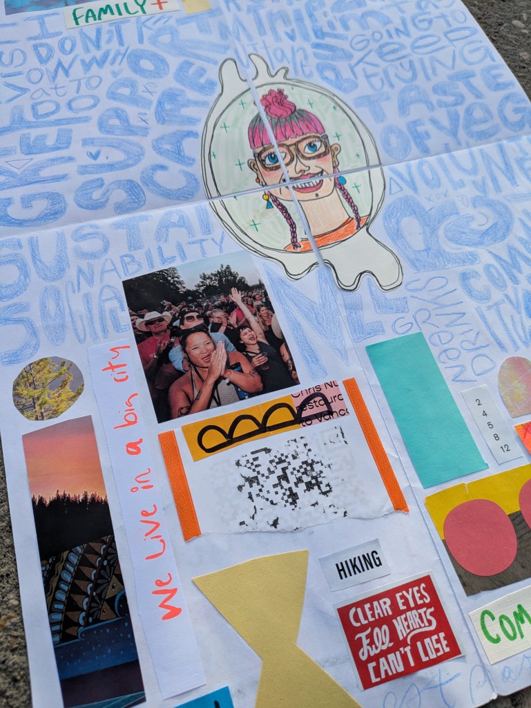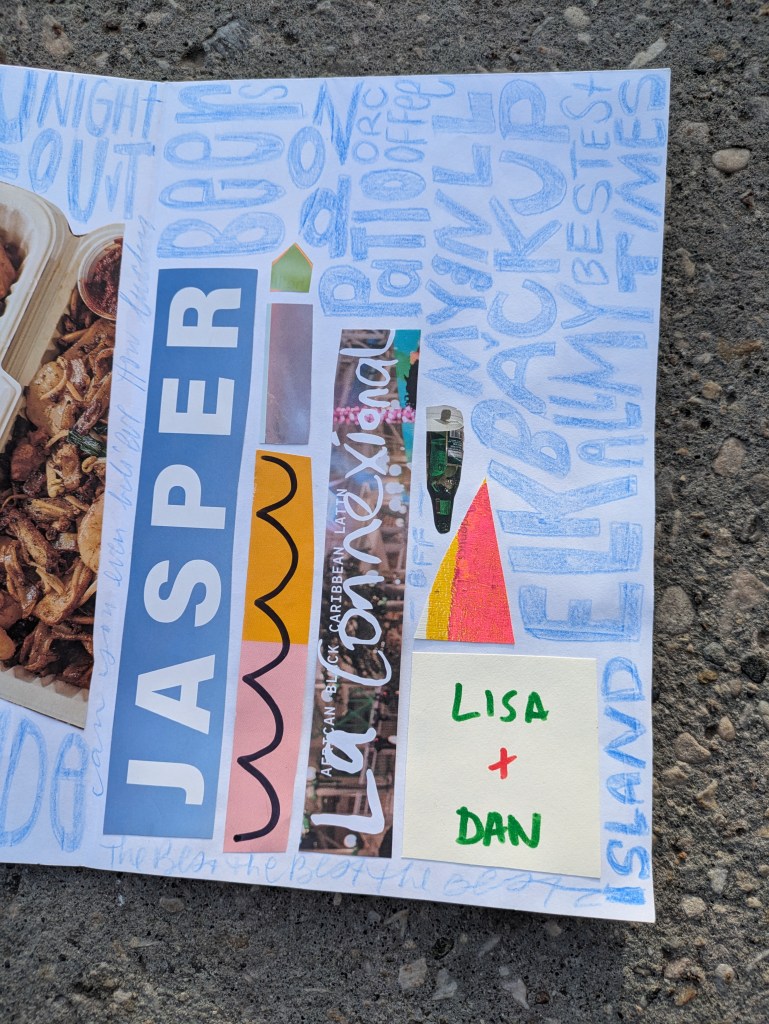My theme for this zine is “connection” and I divided it into 4 parts: Lucas, Dan, family, community. I used pencil crayons and magazine elements for collage. The base is an 11×17 piece of printer paper folded in half twice. Closed, the finished zine measures 5.5 x 8.5 inches.