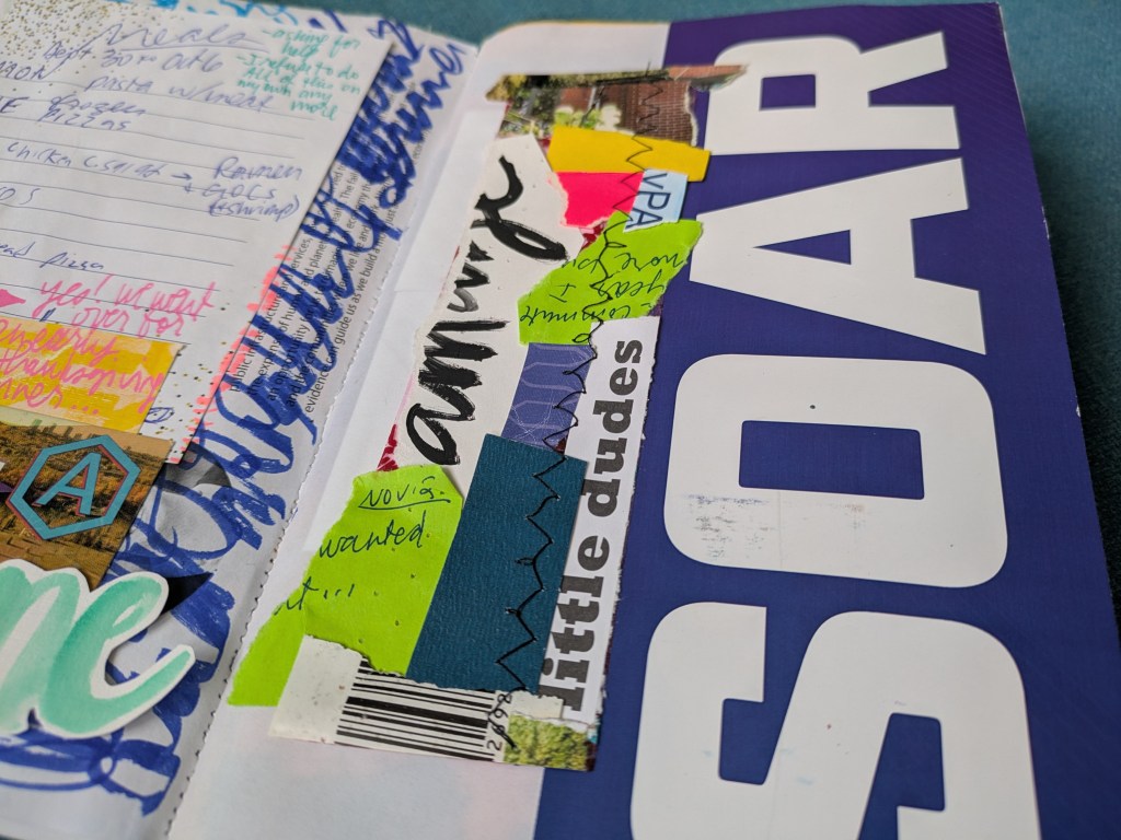 If you are really stuck for what to write, grab a fat marker and write big, expressive letters all over the background of one of your pages. This is great for a few reasons. It helps hide super personal journaling, and it gets past the “blank page” problem when you’re starting on a new spread.